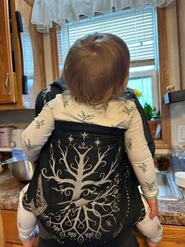 Flowing ecru trees shine through a black background on this organic cotton baby carrier. Named for the substance made from Mithril, Ithildin is used to create magical inscriptions which are only revealed when the correct incantation is said in the reflected light of the Moon and stars.