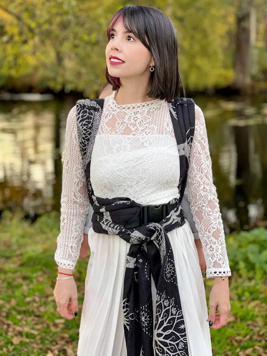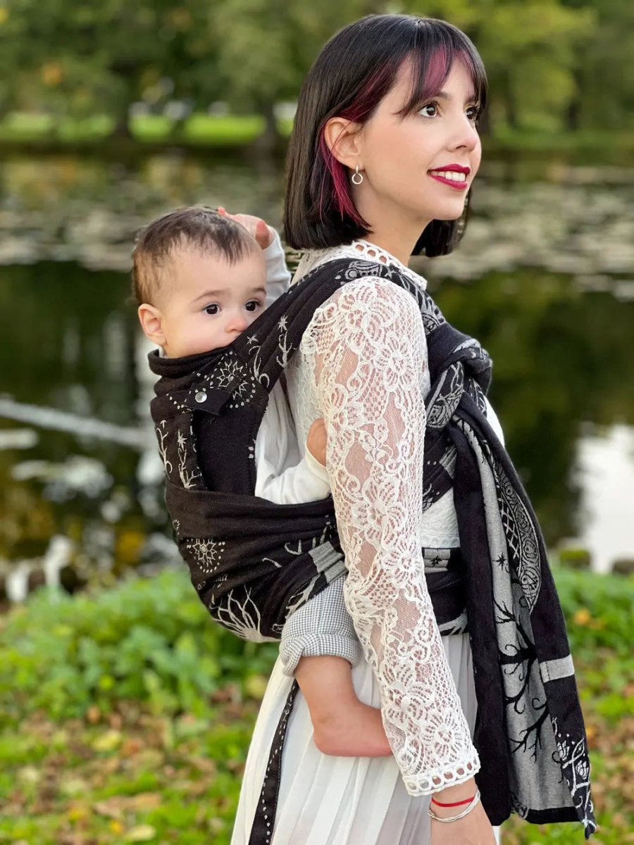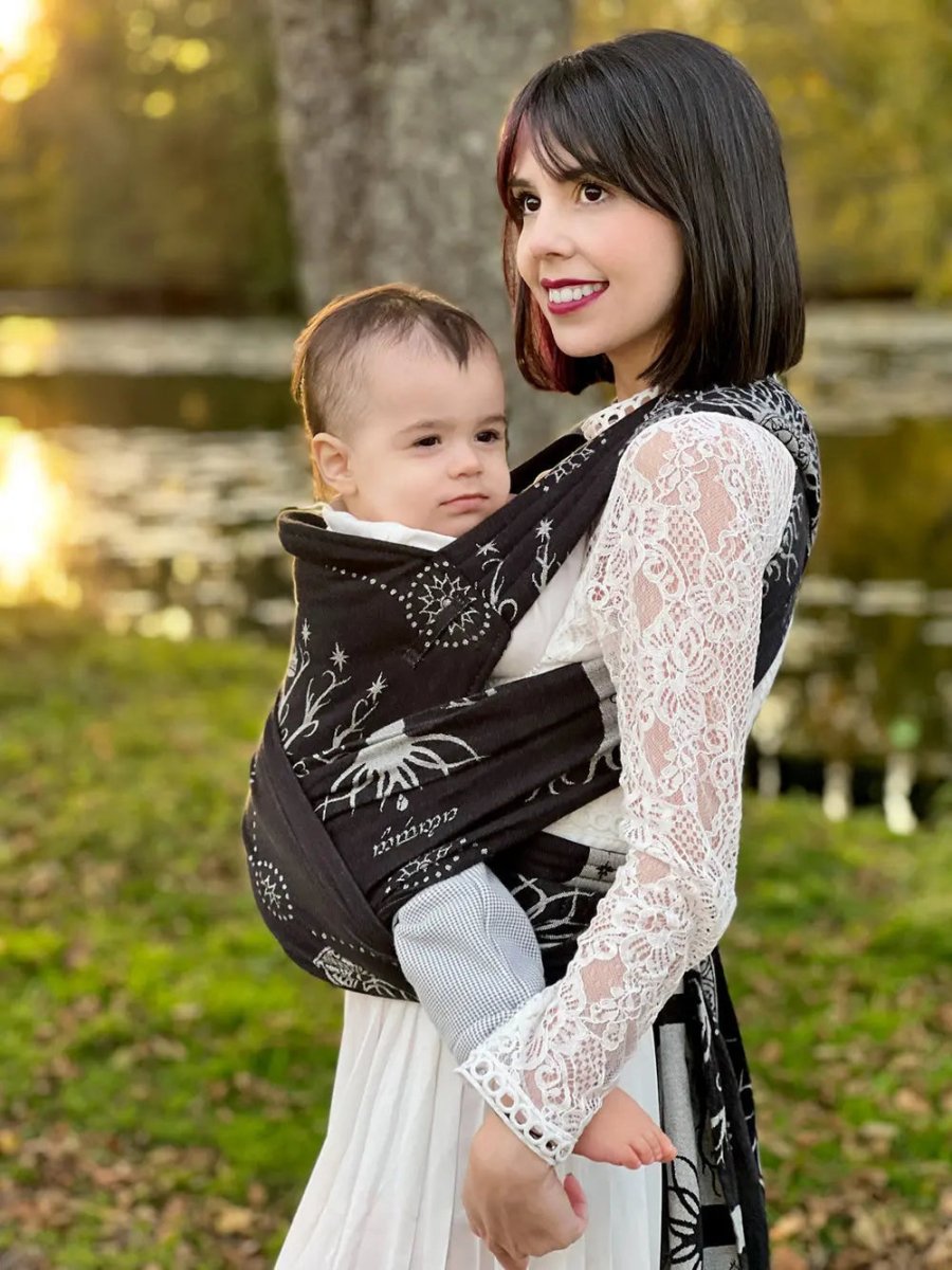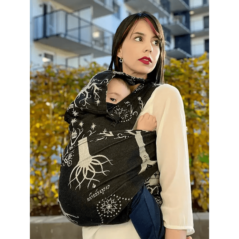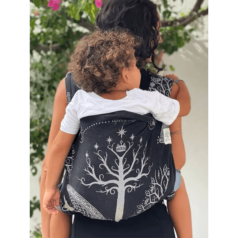Flowing ecru trees shine through a black background on this organic cotton baby carrier. Named for the substance made from Mithril, Ithildin is used to create magical inscriptions which are only revealed when the correct incantation is said in the reflected light of the Moon and stars.