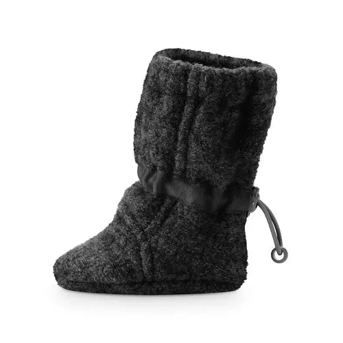 These newborn booties made from 100% boiled wool keep little feet warm without overheating. They are the smallest version among the Mamalila booties and fit from birth to about six months.The boiled wool booties are modelled on the shape of the foot, are easy to put on - and stay on: the adjustable drawstring around the ankle makes sure of that. They match the Vienna hooded babywearing coat in terms of colour, as they are made from the remnants from coat production and would otherwise be thrown away: that's what makes them so sustainable!