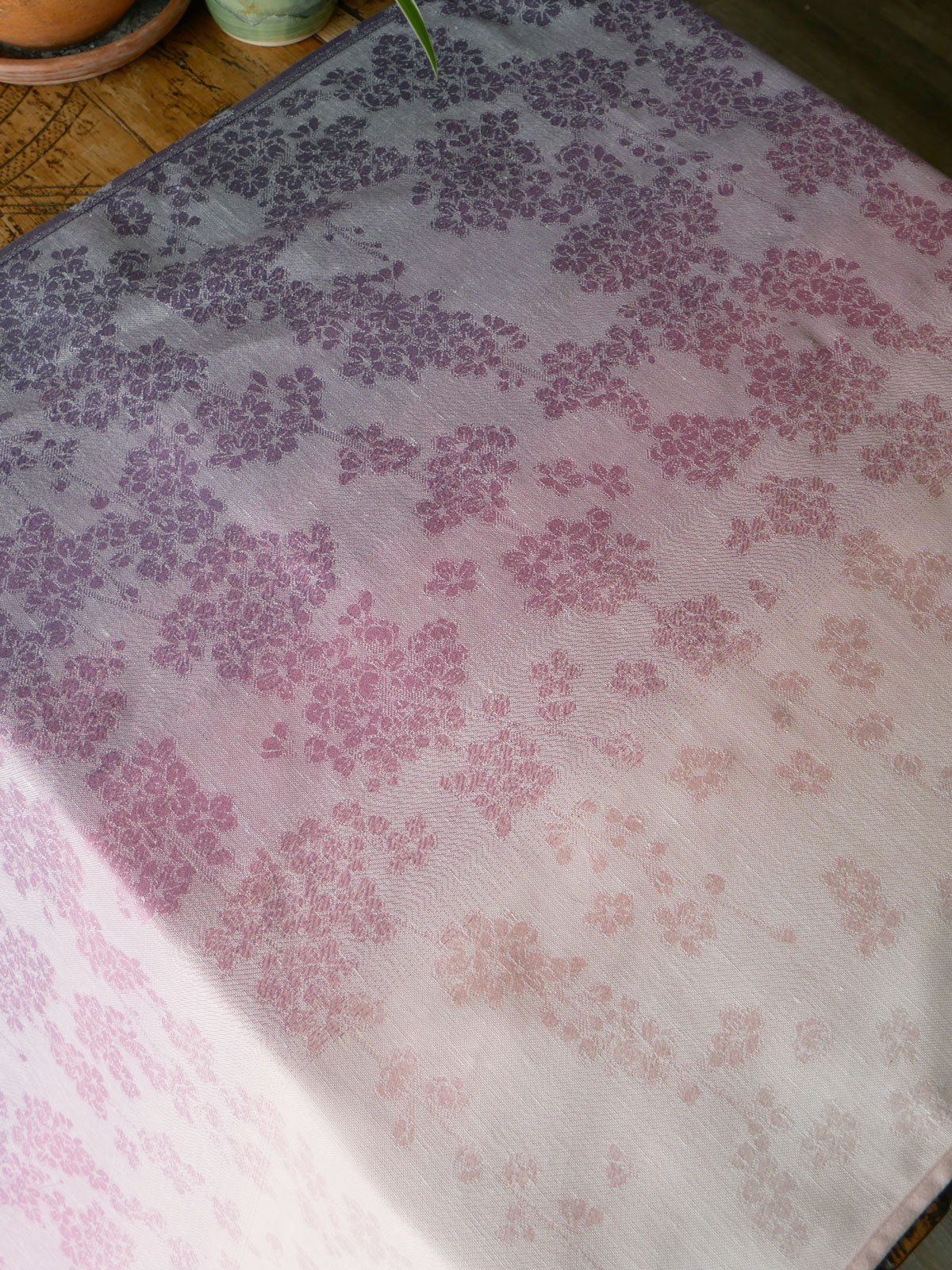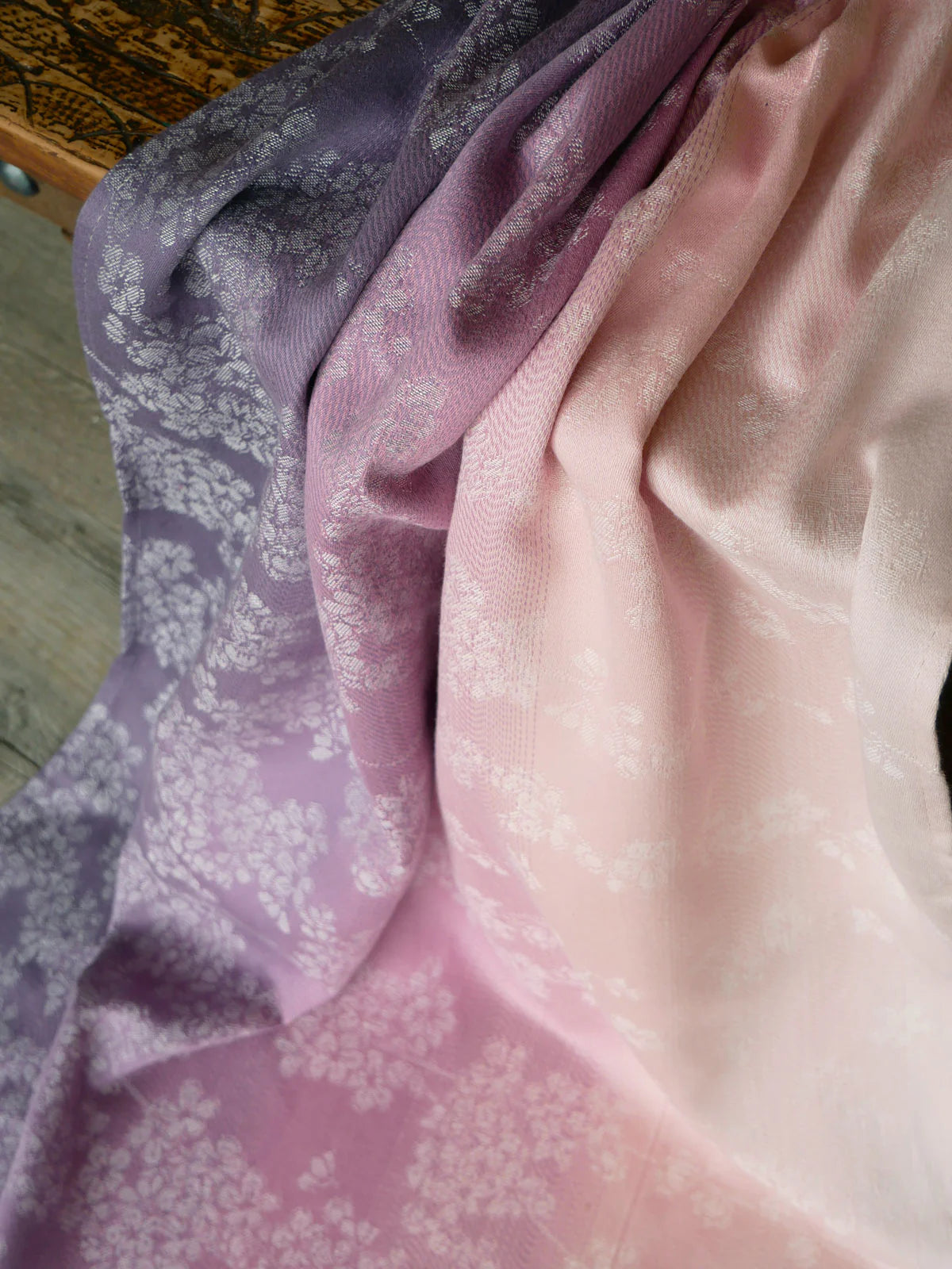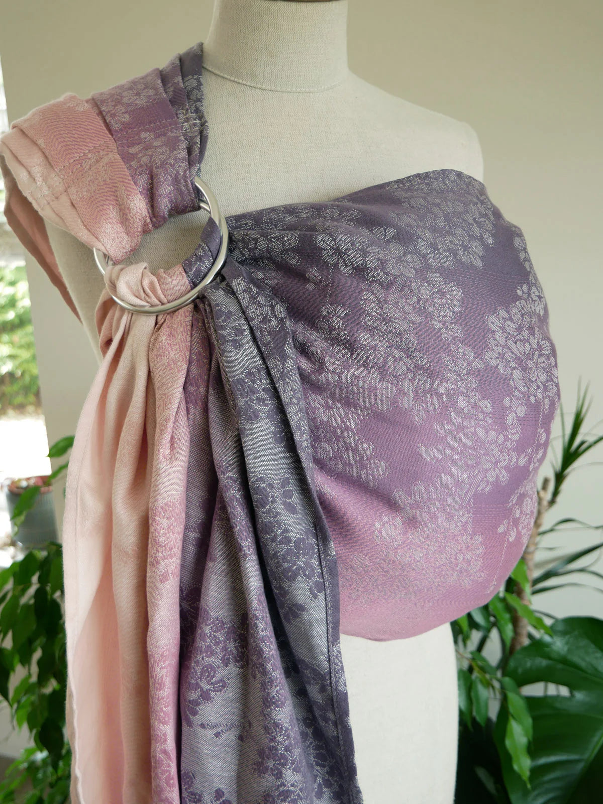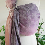 Blossom Evelyn Ring Sling is a light, breathable carrier featuring a delicate floral gradient inspired by antique blooms. Brilliant white blossoms cascade across shades of purple heather, dusky pink, and soft baby pink, creating a soft, elegant look perfect for everyday use.