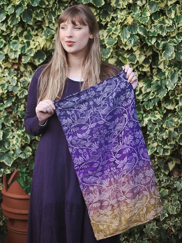 Antique White Bourette silk highlights the intricate Briarwood pattern on a shimmering, regal Mako cotton warp. The opulent background transitions seamlessly from regal purple to radiant gold, while the characteristic nubs and slubs of the Bourette yarn give each piece a unique, textured look.