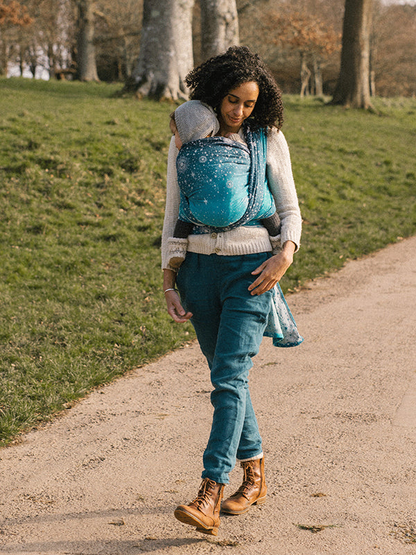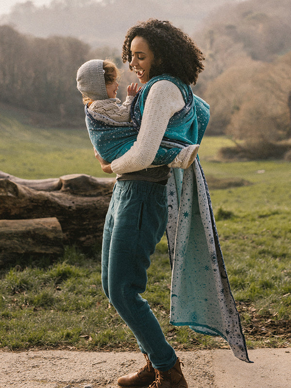 Lighter than our previous towel wraps, it uses a finer cotton chenille creating a softer, smoother texture and more luxurious feel. The lightweight qualities make this fabric quick to dry and easy to tuck in your beach bag when not in use. This sling can carry your baby to the beach, be used to dry them off after a dip, and then to carry them home again. Once dry, it seamlessly transforms into a cosy blanket, ready to snuggle your little one during the journey back home.