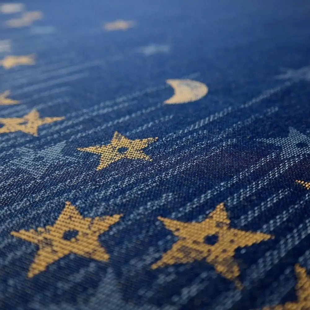 A deep blue firmament, a silvery moon and golden sun surrounded by a myriad of twinkling stars. Woven in gold and silver, the stars, the sun and the moon are glittering on a deep blue background. The pattern is the same on the other side, yet the colour palette is reversed.