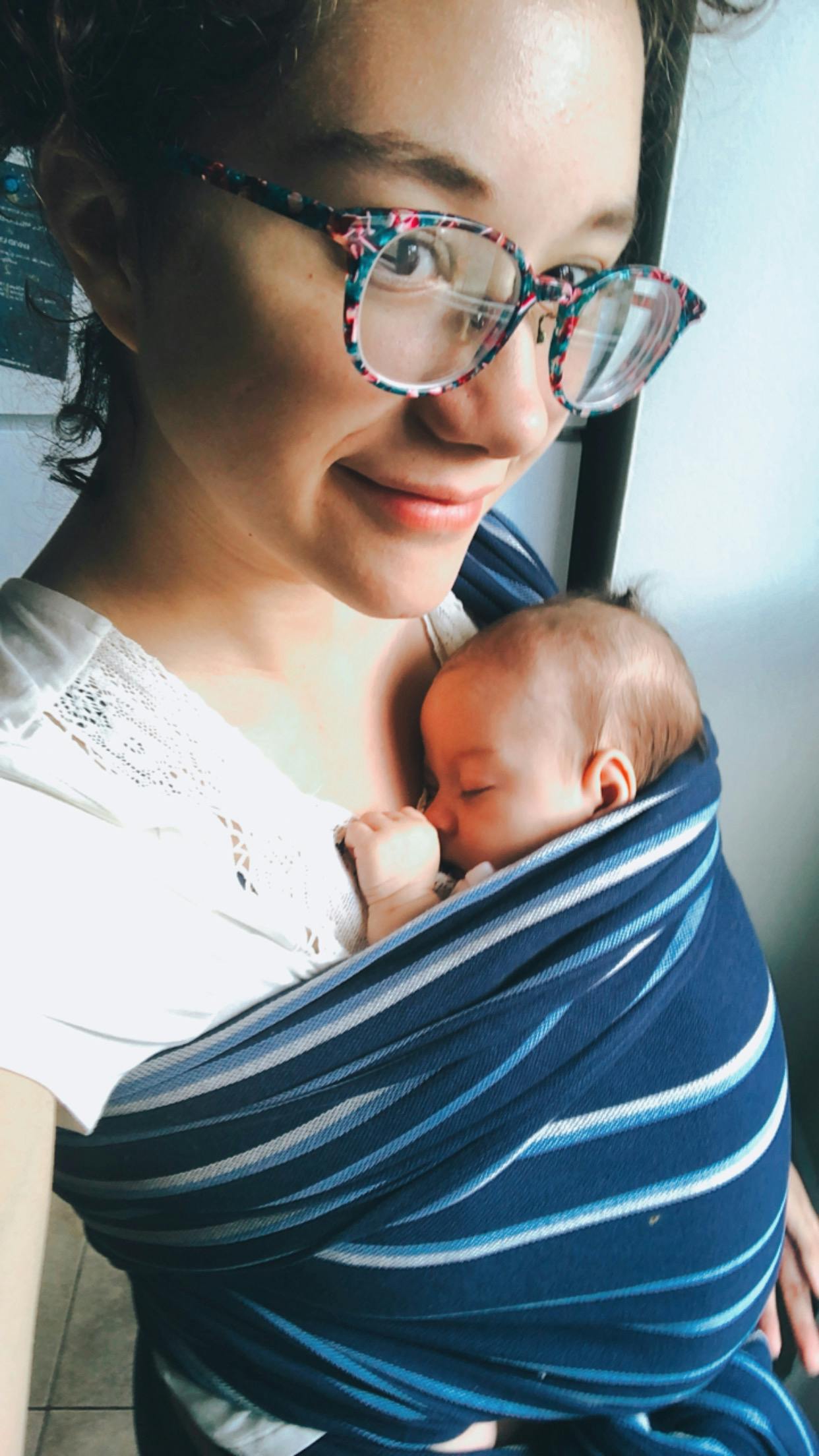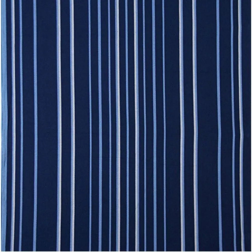 With classic, narrow light blue stripes on a dark blue background. Woven from a cross twill fabric, robust, with diagonal stretch. This is a very sturdy and light wrap - Great for beginners and experts alike.