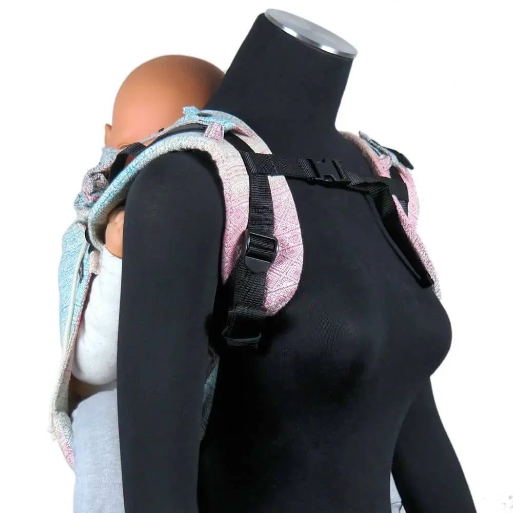 Didymos Onbuhimo Prima Aurora made from the fan fave, Prima Aurora - a natural background with cotton candy blue and pink dotted playfully throughout.