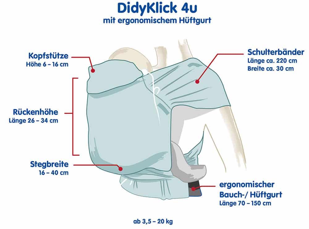 The DidyKlick 4u is a half-buckle carrier and combines the comfort of a full buckle carrier with the versatility of a baby wrap sling.