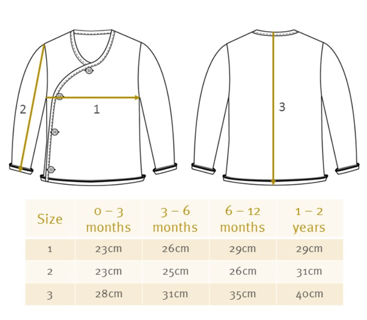 - 0-3 months: Chest 9", Sleeve 9", Length 11"