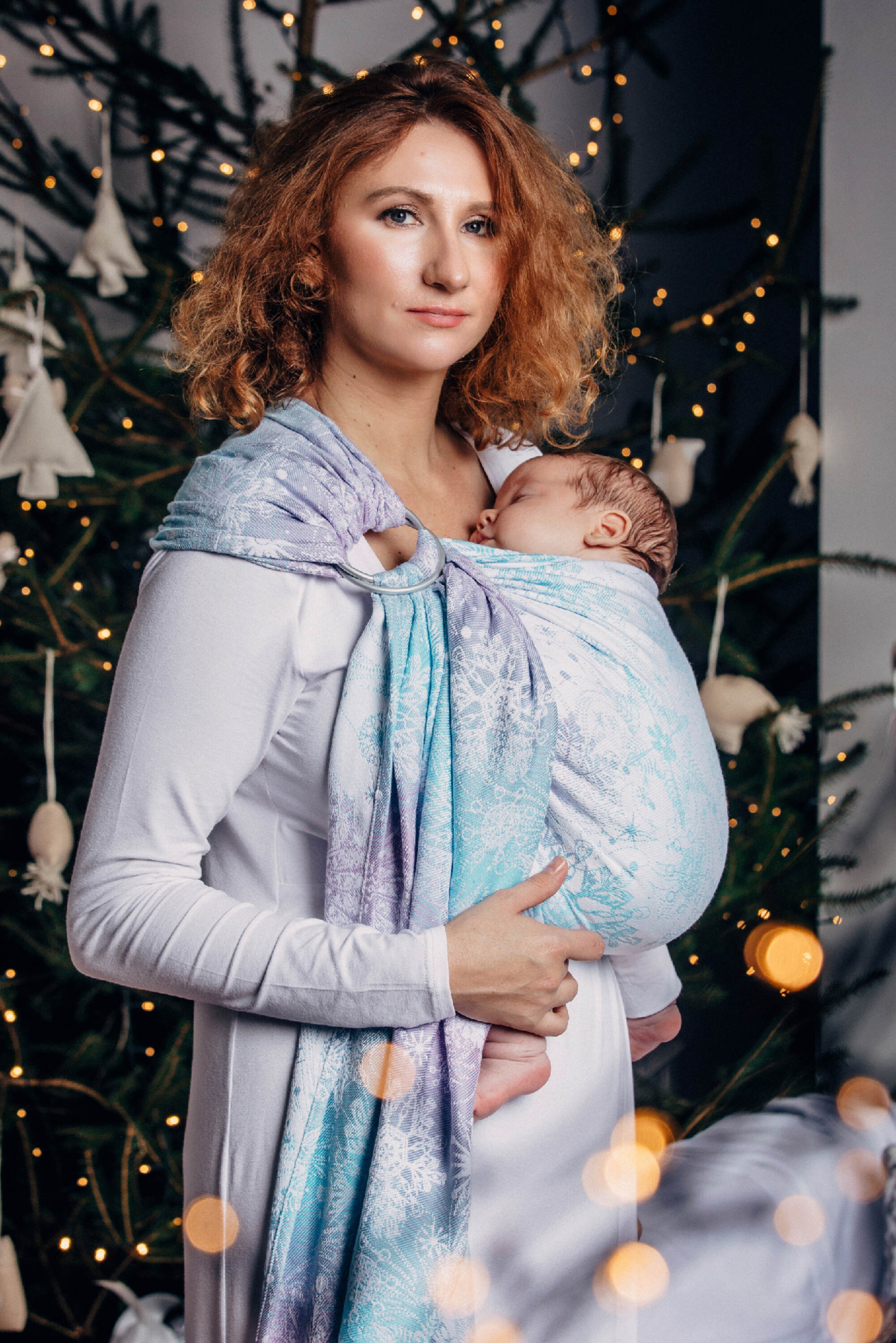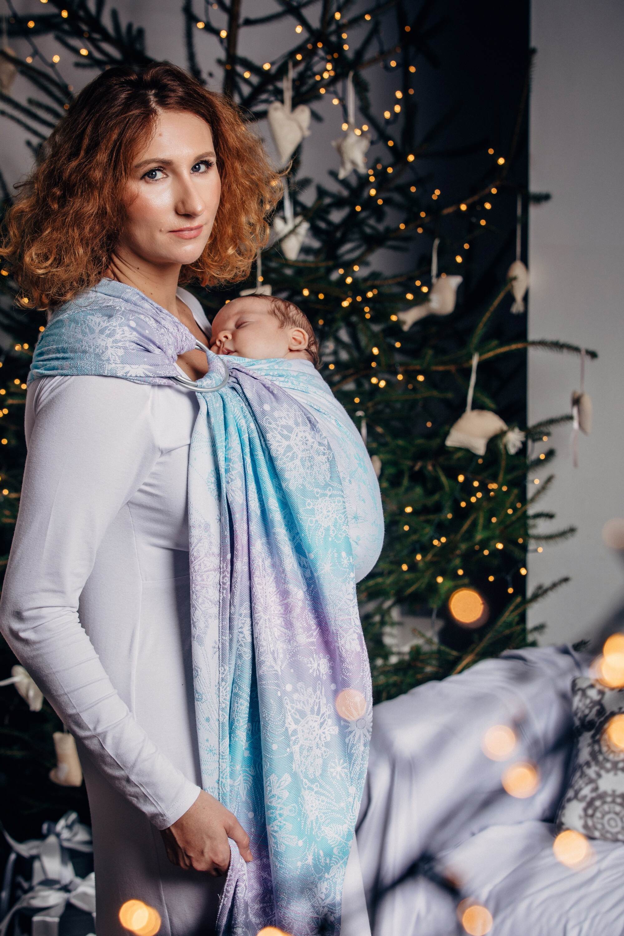 Glittering Snow Queen Design: A stunning winter-inspired design featuring sparkling silver and icy blue tones, reminiscent of a magical frozen wonderland. This exclusive colorway combines elegance with enchantment, perfect for creating memorable babywearing moments.