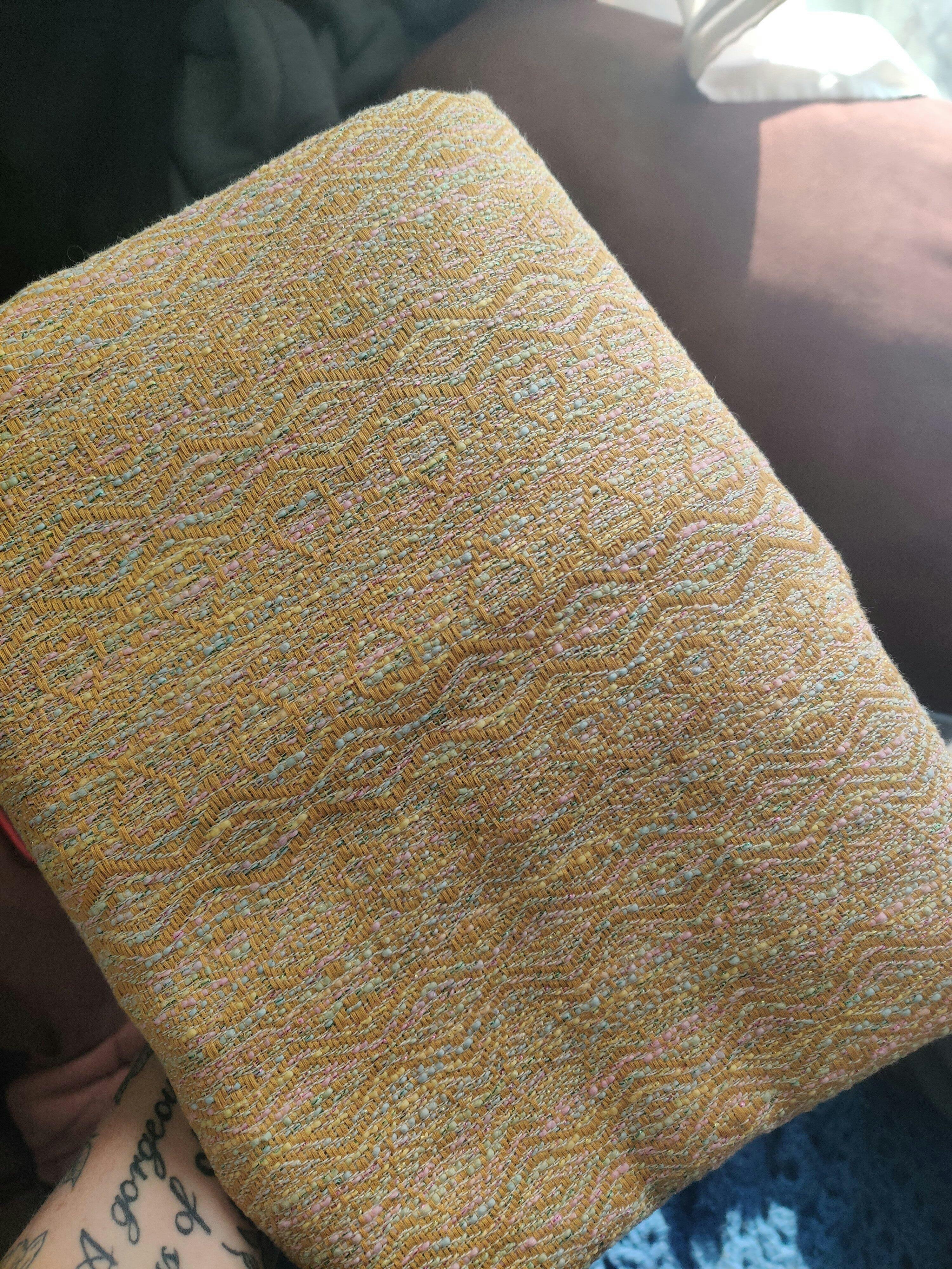 The golden harvest tone recalls candlelight and late afternoon sun. Fine, colourful shimmering threads run through the weave, like tiny sparks that bring light to ordinary days. When you wrap your child, it feels as if a few of those sparks settle gently across your shoulders – a touch of celebration, even on an ordinary Monday.