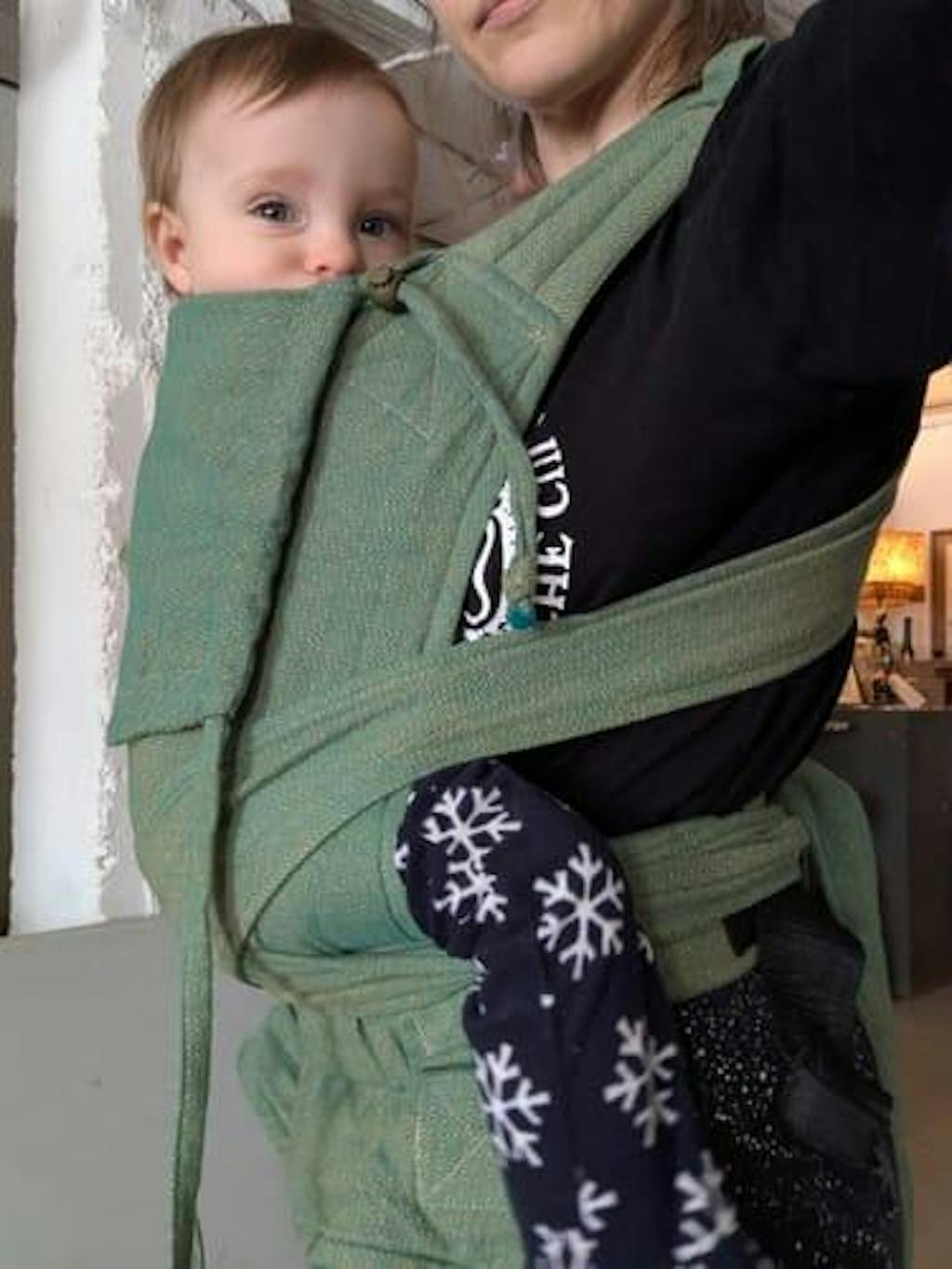 Always follow the T.I.C.K.S. guidelines for safe babywearing: Tight, In view, Close enough to kiss, Keep chin off chest, Supported back. Never use a baby carrier while driving or cycling.