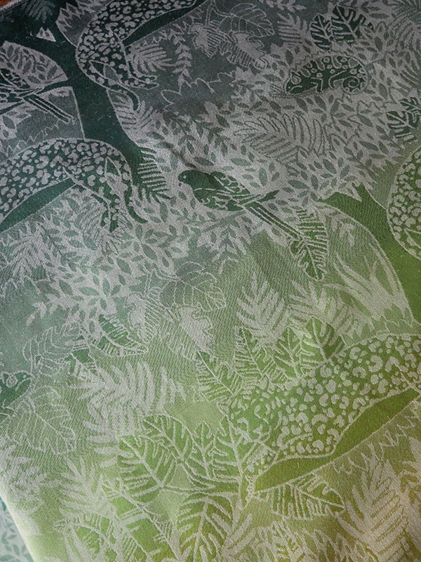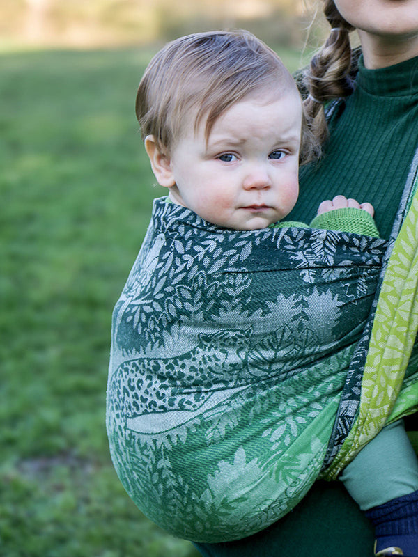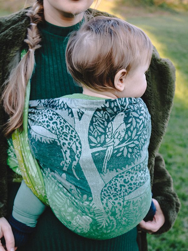 Jungle Through the Glade is a lightweight and breathable wrap with a nature-inspired print that has a modern twist. It's soft straight from the bag, making it perfect for newborns and beginners, but this unique blend also offers support for older children.