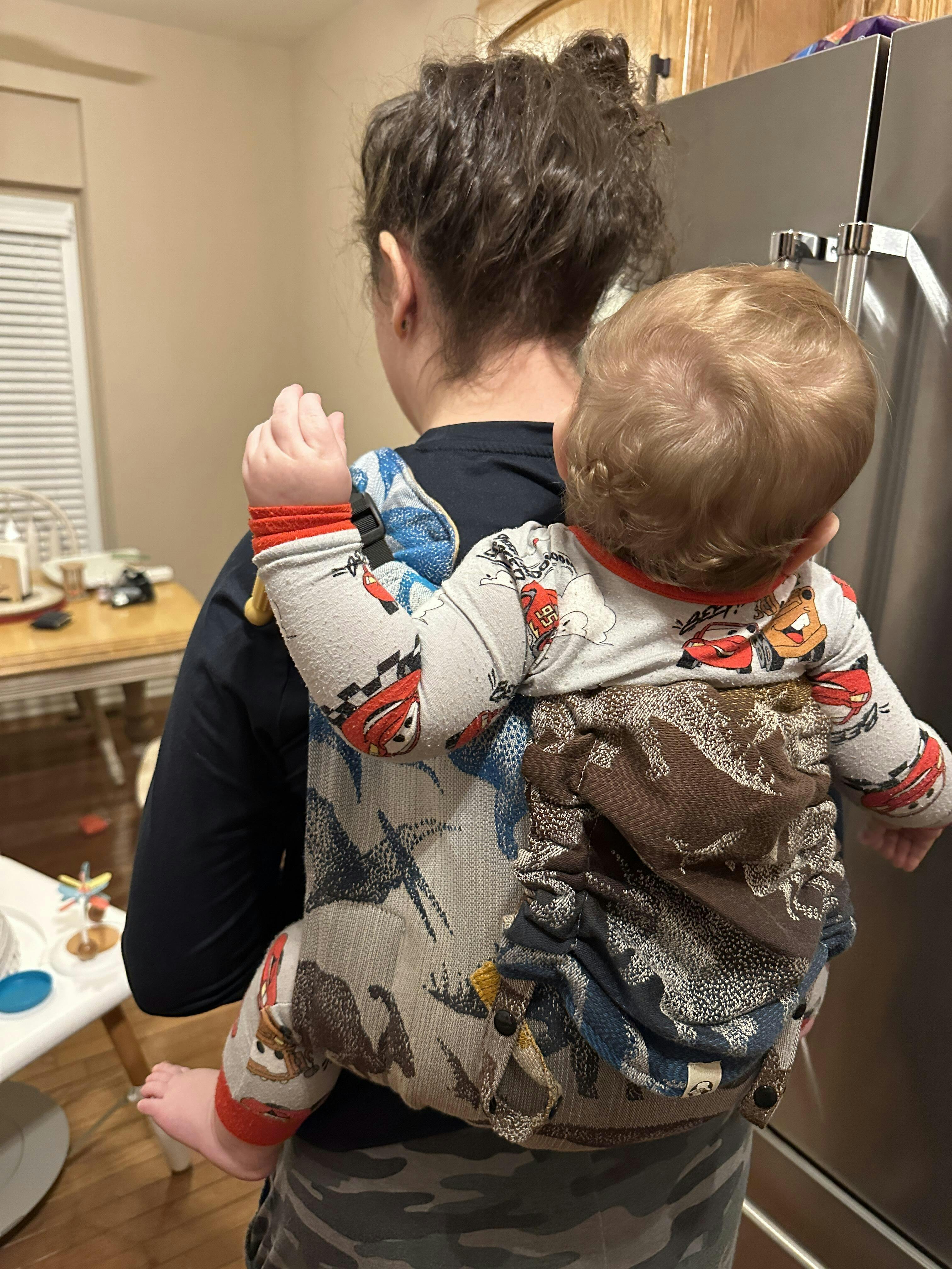 The panel width adjusts easily (10.6–17.7 in / 27–45 cm) as your baby grows, making this carrier last longer. Designed primarily for back carrying, with an optional front carry for shorter periods.