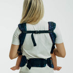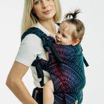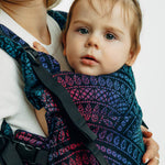A fully adjustable ergonomic baby carrier for newborns through toddlers, made from LennyLamb woven wrap fabric for the softness and support of a wrap with the convenience of a buckle carrier.