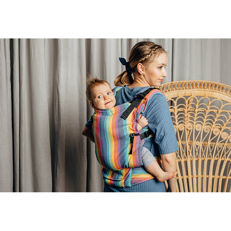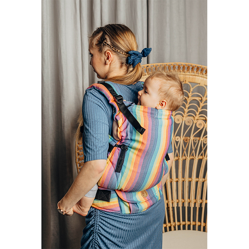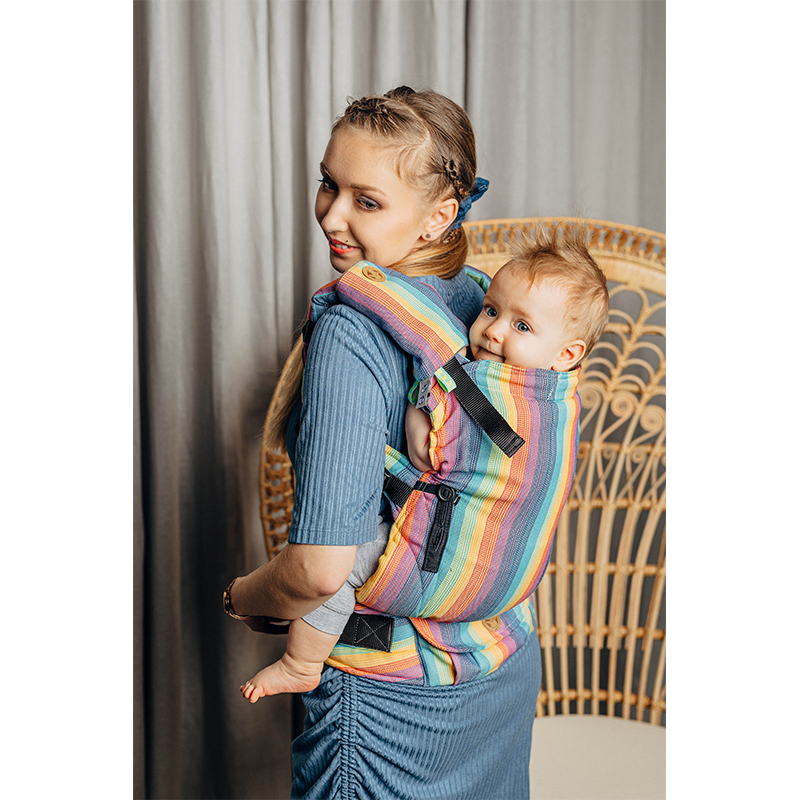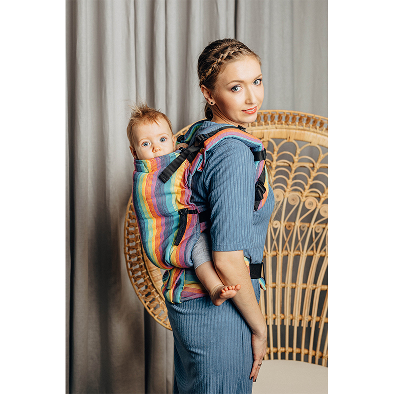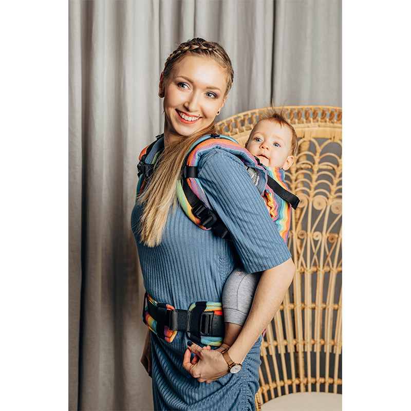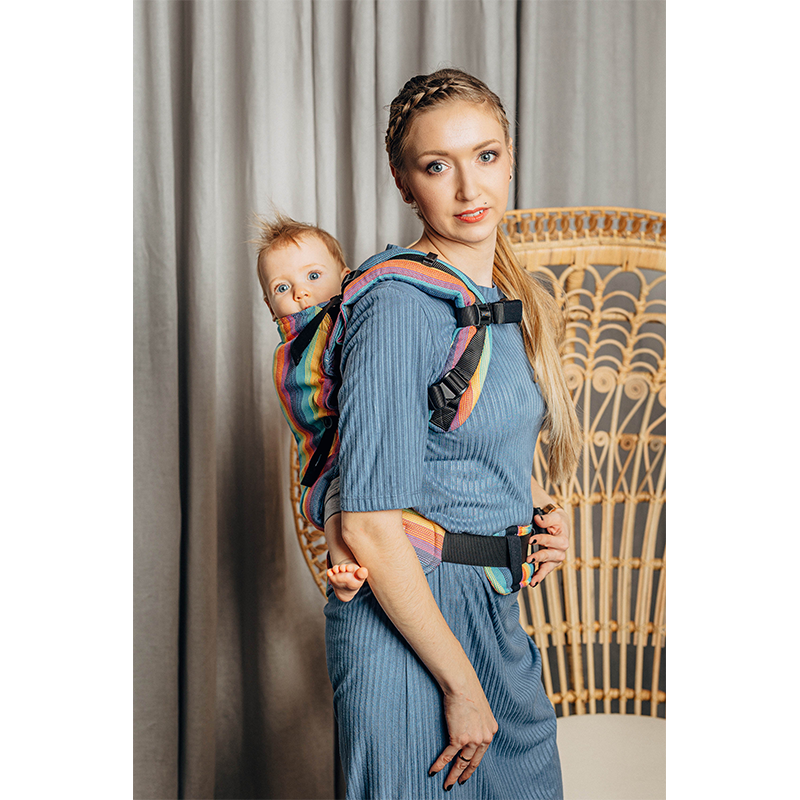 ATTENTION: Actual colors and pattern placement may vary from pictures. The color of the buttons can vary from the one presented in the pictures. Depending on the LOT of the product, the straps regulating the size of the carrier's panel can be solid black or in the colorway of the carrier.
