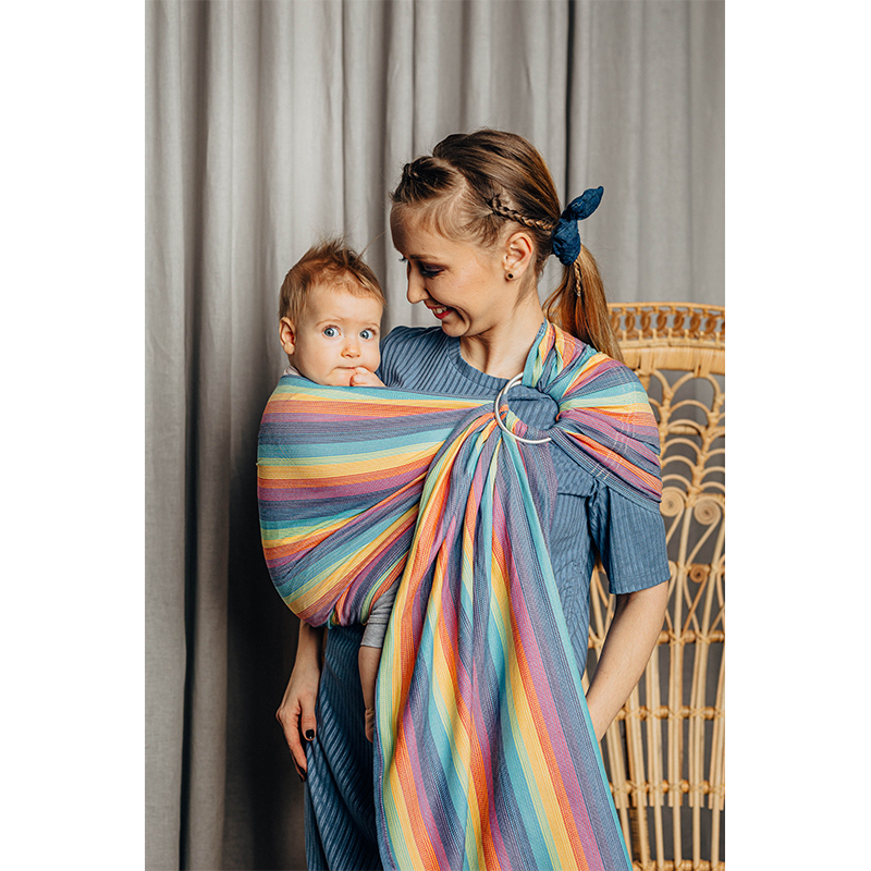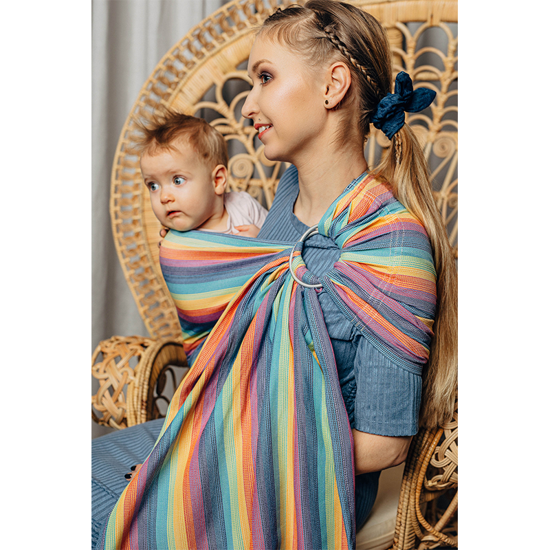 No tying necessary! Just put the sling through the rings, put the baby in the pouch and tighten. It is lightweight and takes up very little space.