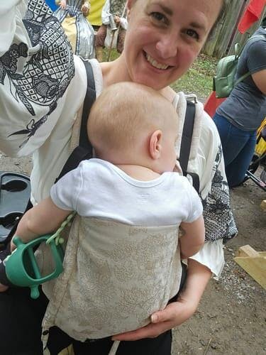 The Onbuhimo carrier, originating from Japan, is worn up high on the back and is designed for babies, toddlers, and children who can sit unassisted. Fast to put on and to take off - ideal for toddlers who love frequent ups and downs!
