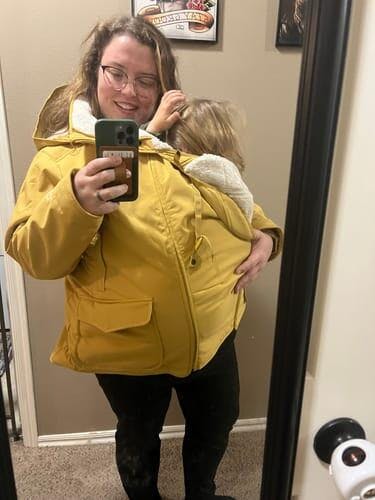The Mamalila Allrounder Softshell Babywearing Jacket is a best-selling, versatile jacket perfect for both maternity and babywearing. Made from 100% recycled fabric with a soft sherpa lining, this jacket is designed to keep you and your baby warm and dry throughout fall and winter. Its modern parka style and cozy plush teddy fleece lining make it a go-to for cold-weather outings.
