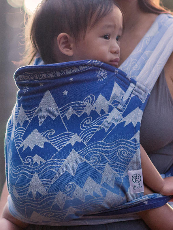 A fade of blues moves from deep midnight tones through lighter hues to a pale, icy blue mist. This beautiful EcoCotton and organic cotton baby carrier offers a lovely balance of softness, cush and strength.