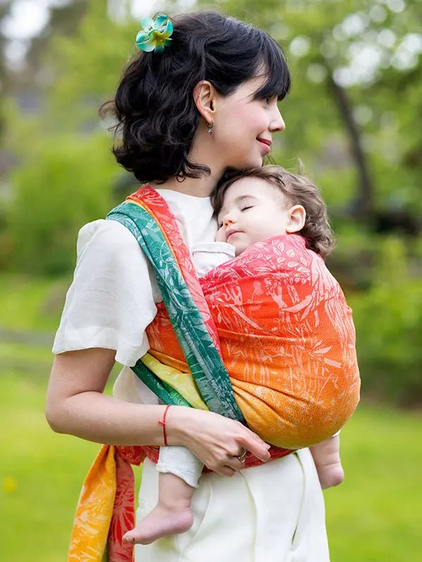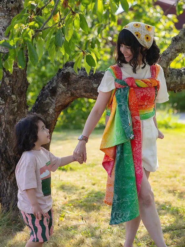 Oasis Dream is easy to wrap, with a nice amount of glide. It’s mouldable with a little stretch, making it a fantastic choice for new wrappers. This stunning design features a lush tropical jungle scene, teeming with life and rich detail. The gradient flows from berry red through warm oranges and yellows into leafy greens, creating a vibrant celebration of nature and colour that evokes the warmth and beauty of the tropics.