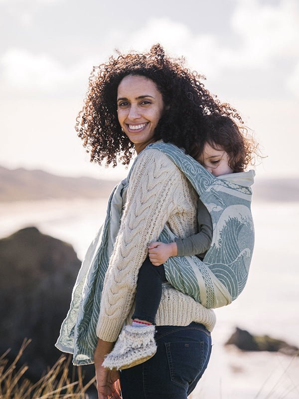 A soft blue-teal contrasts with natural ecru tones to bring a wonderfully vintage feel to Oscha's Okinami pattern. A lovely slubby yarn, our cotton and hemp blend speckles this fabric with little flecks bringing a soft and earthy feel to this beautiful baby carrier.