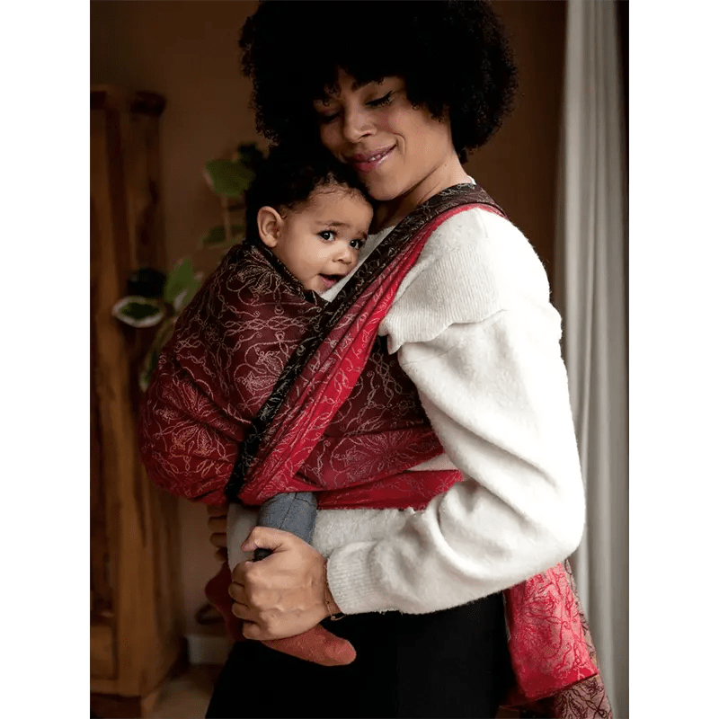 Woven using a medium-weight linen yarn, this organic combed cotton and linen blend offers an enjoyable wrapping experience. A stunning fade of gold and silver picks out the flowing leaf design inspired by the Mallorn leaves of Lothlorien. The melange linen creates a textural effect and a shimmer across the wrap. The background transitions from a hint of black coffee to deep, rich burgundy, and finally fading to vibrant bright reds.