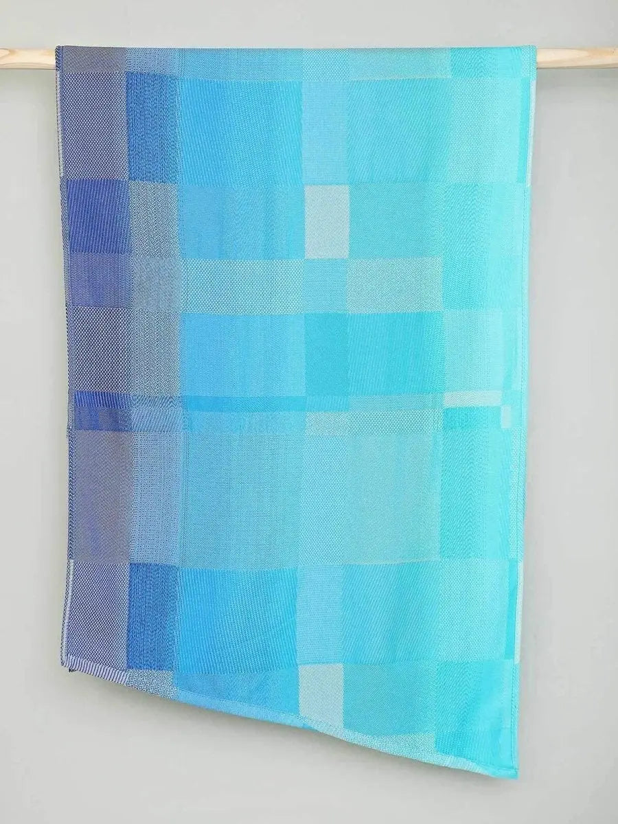 Traditional weave structures are set out in a striking interlocking block pattern. Set against a bright ocean fade, our lovely textural design really shines in this new colorway.