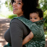 Named after the Westfarthing, one of the four Farthings of the Shire and the centre of Hobbit authority, this beautiful Cairis carrier is woven on a deep forest green organic cotton backdrop. The bustling Shire pattern is picked out in alternating Tencel and hemp yarns in white.
