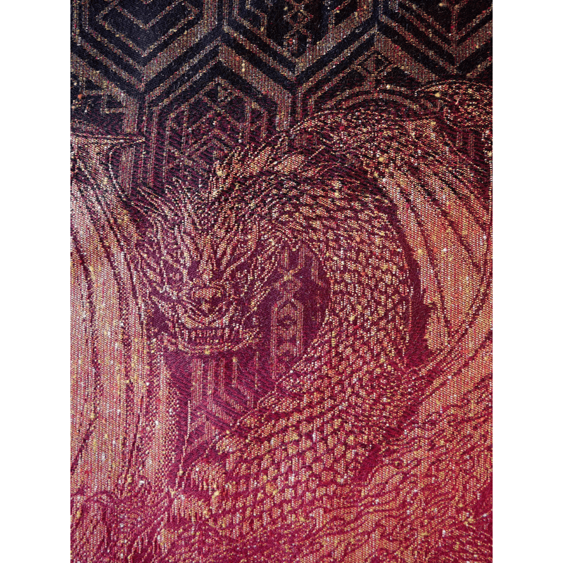 This fusion of our much-loved Smaug and Oakenshield patterns features the fearsome dragon in fiery colours against a background that transitions from a hint of black coffee to deep, rich burgundy, and finally fading to vibrant bright reds. The characteristic nubs and slubs of the silk weft that speckle the fabric resemble the sparkle from the shields that Smaug sits atop.