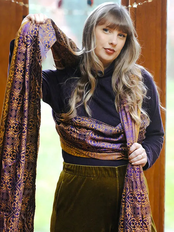 The opulent background transitions seamlessly from regal purple to radiant gold with the ornate Victoriana pattern picked out in gold bamboo viscose. This weft not only enhances the regal look but also contributes to the wrap’s soft texture and lightweight drape. The charm of Victoriana design with the luxurious feel and rich colours evoke an air of timeless sophistication and vintage grandeur.