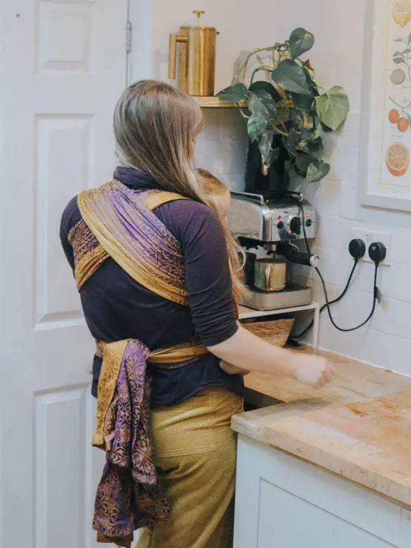 Victoriana Royal is a wonderfully lightweight but supportive wrap. The Mako cotton and bamboo viscose blend is a perfect combination of softness and beautiful sheen. The wrap glides effortlessly into place making it perfect for beginner wrappers and young babies. It’s also suitable for older babies when wrapping with multiple passes.