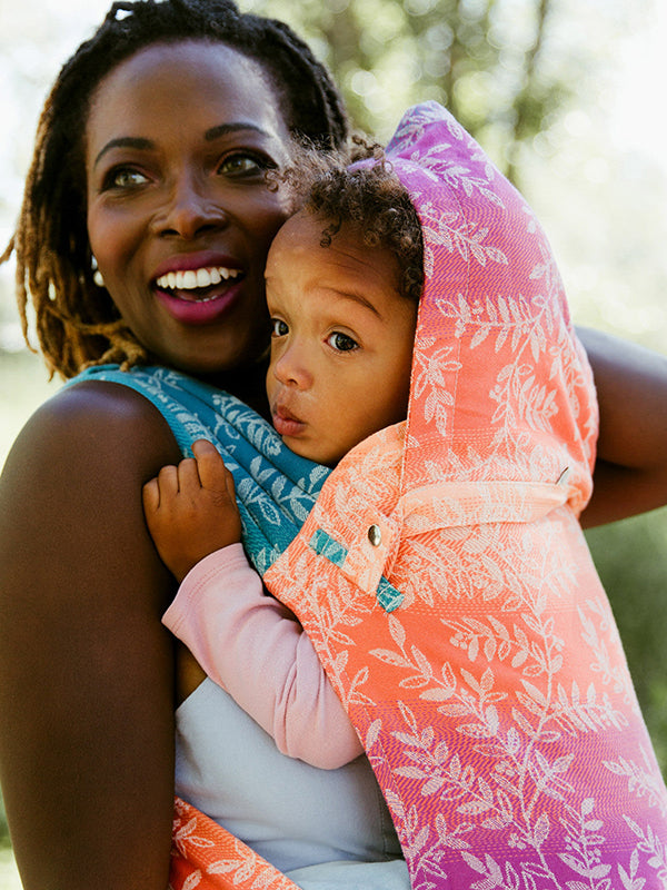 This beautiful, breathable baby carrier features a stunning fade from aqua blues, through purples and pinks to a lovely peachy tone. Our twisting Willow pattern is picked out in recycled eco cotton for a colourful sling which is perfect for little ones and toddlers alike.